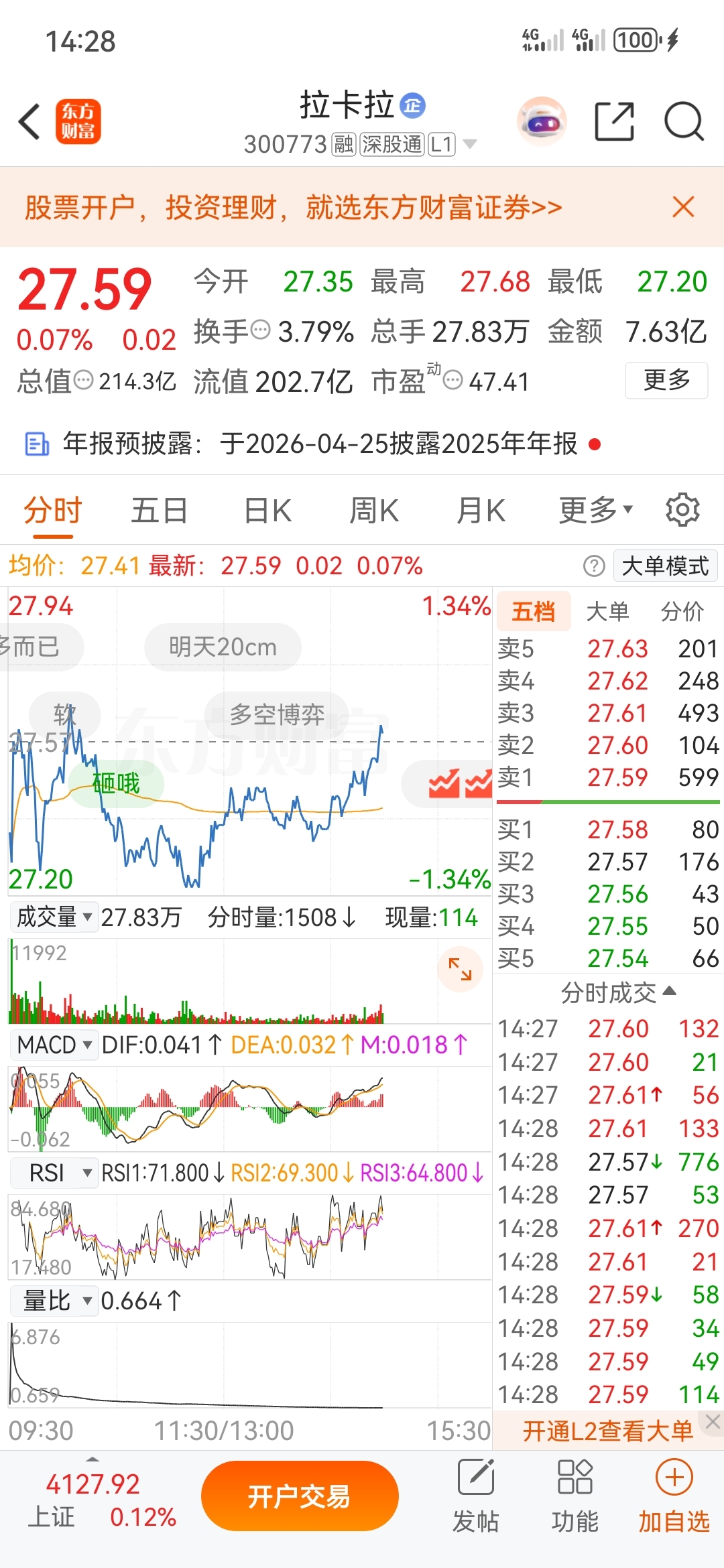 拉卡拉从跌到红了,你可是一直红的,别收盘绿了丢人