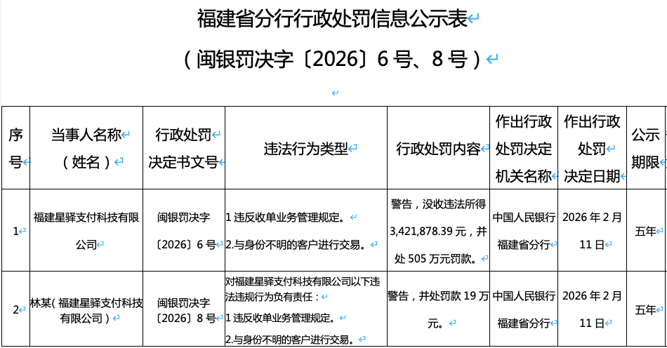 2月13日,中国人民银行福建省分行公布一则行政处罚信息,福建星驿支付科技有限公司(下称“星驿支付”)因违反收单业务管理规定、与身份不明的客户进行交易,被警告、没收违法所得342.19万元,并处505万元罚款。该公司相关责任人林某也被警告,并被处以罚款19万元。