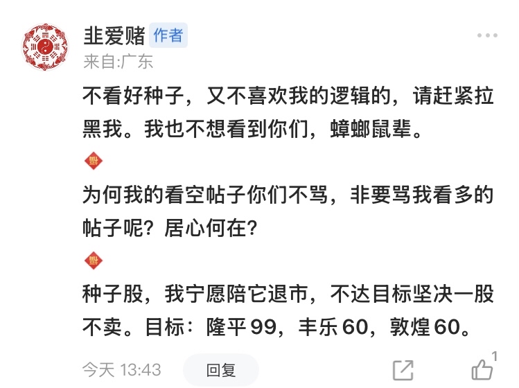 $隆平高科(SZ000998)$ 看看“韭爱赌”是怎么说的:“种子股,我宁愿陪它退市,不达目标坚决一股不卖。目标:隆平99,丰乐60,敦煌60”。