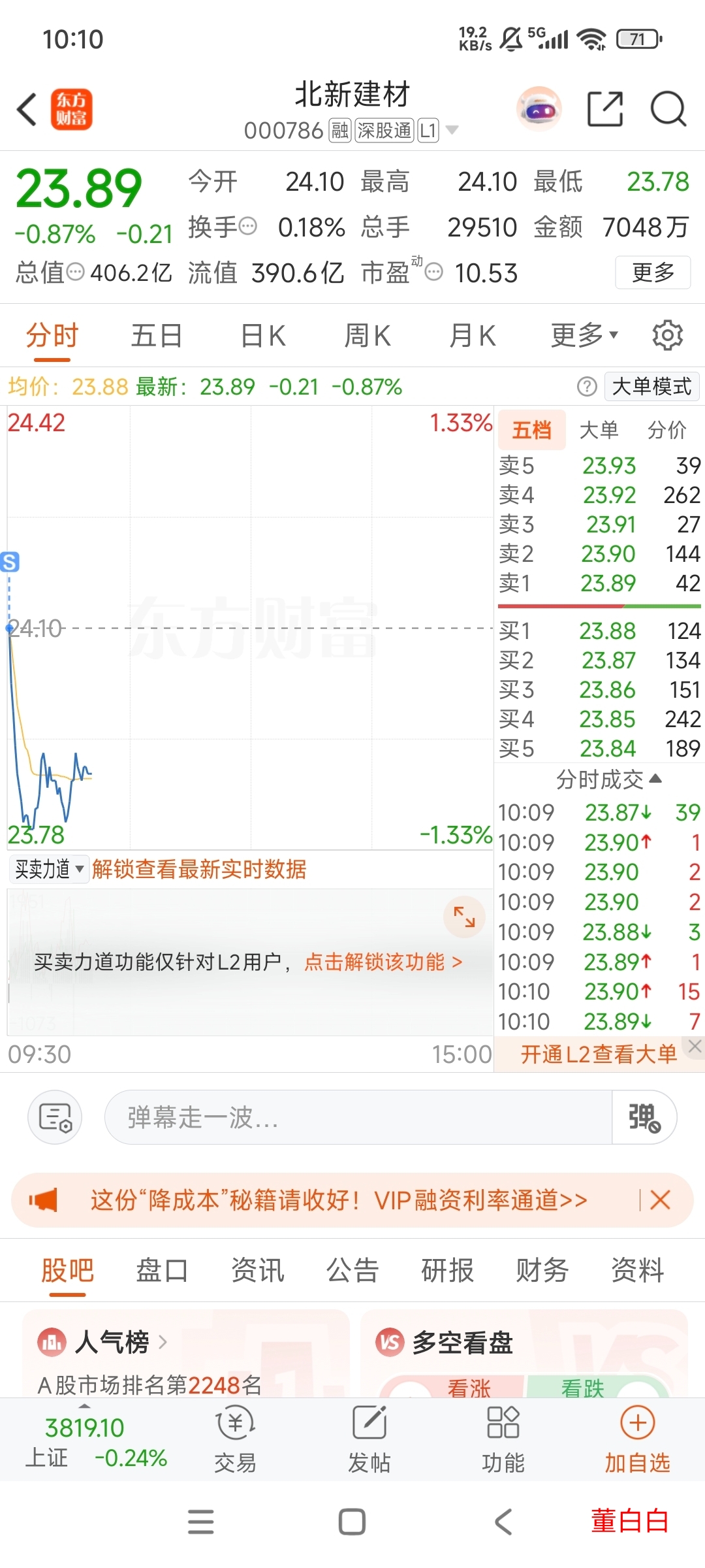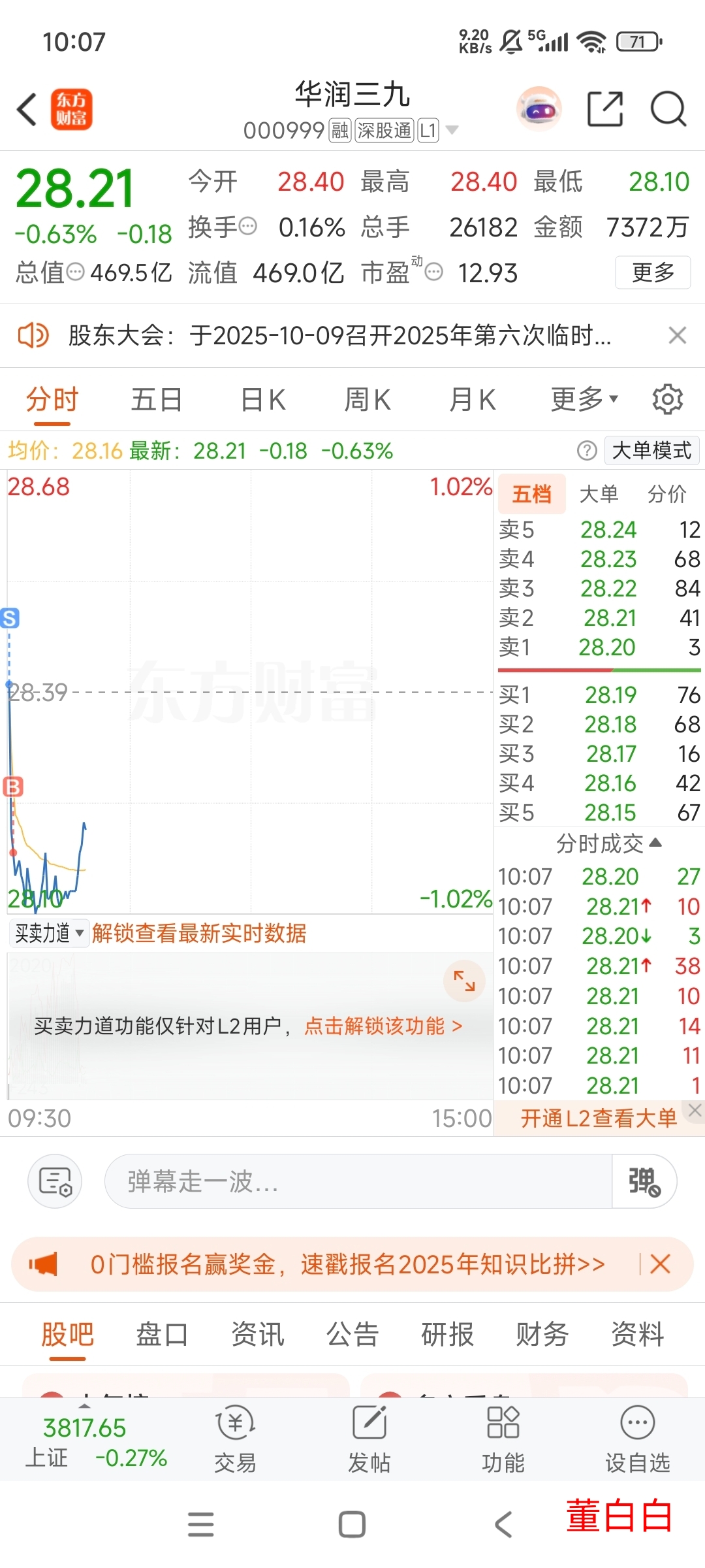 $华润三九(SZ000999)$ $北新建材(SZ000786)$ 今天终于把三只股票减到一只了,早上止盈了北新建材,在资金不多的情况下专注一只股票感觉会更好一些,现在仓位又轻松了许多,只有五成仓了,慢慢玩吧,华润三九涨跌都可以,我陪华润三九到它退市