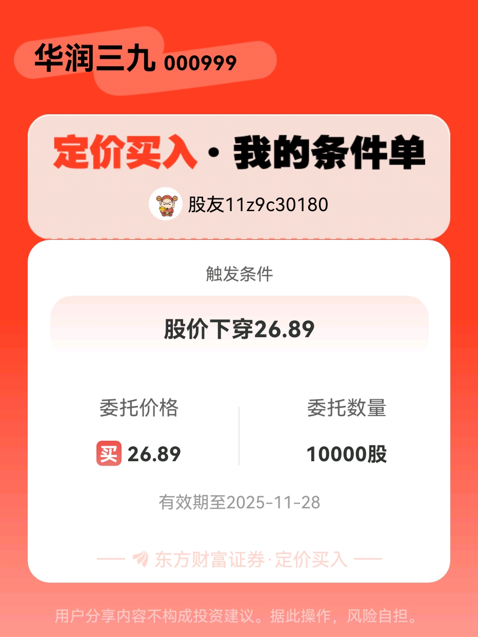 #条件单交流# #定价买入晒单# 一位股神设置了一个定价买入条件单,接下来就是见证奇迹的时刻~$华润三九(SZ000999)$
