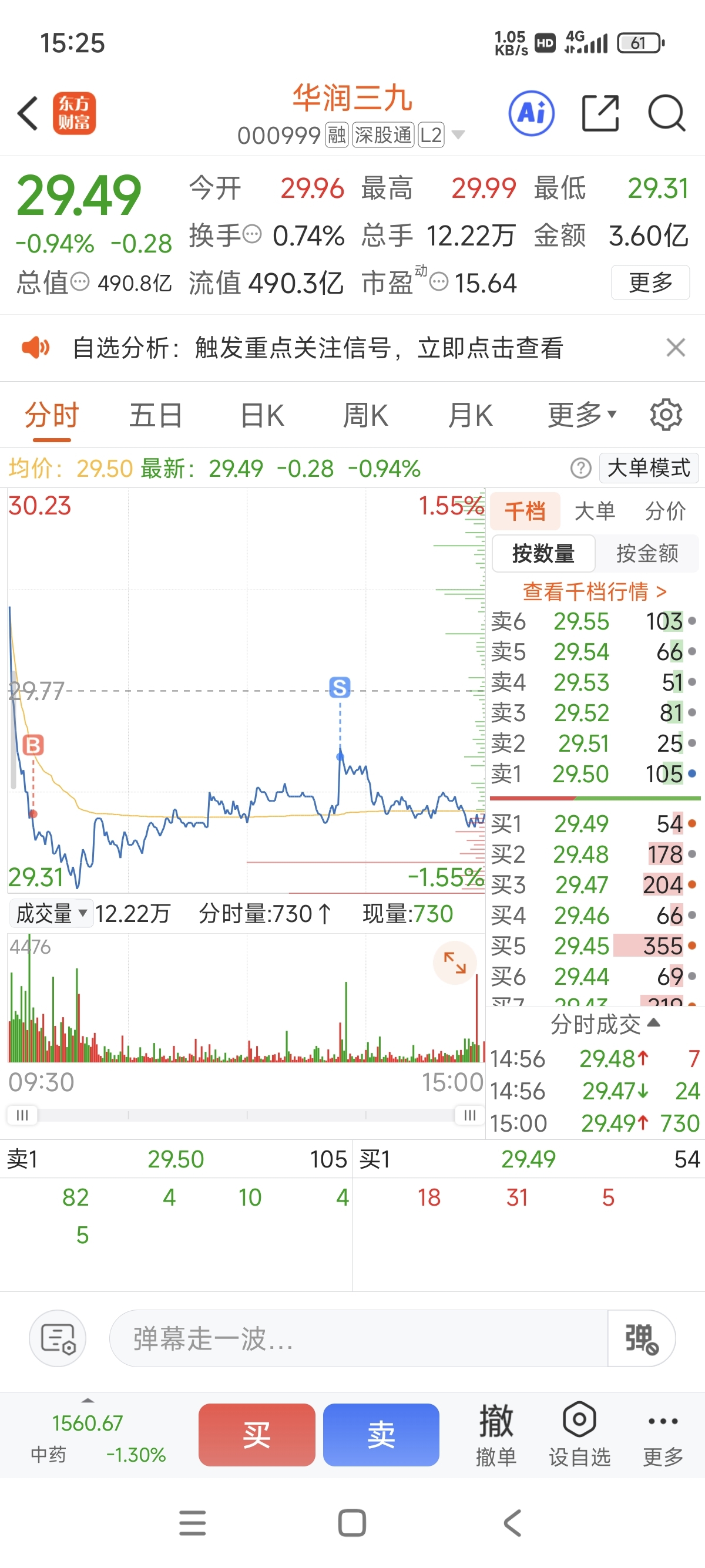 $华润三九(SZ000999)$ 虽然做T赚了一毛多,还是买早了。。
