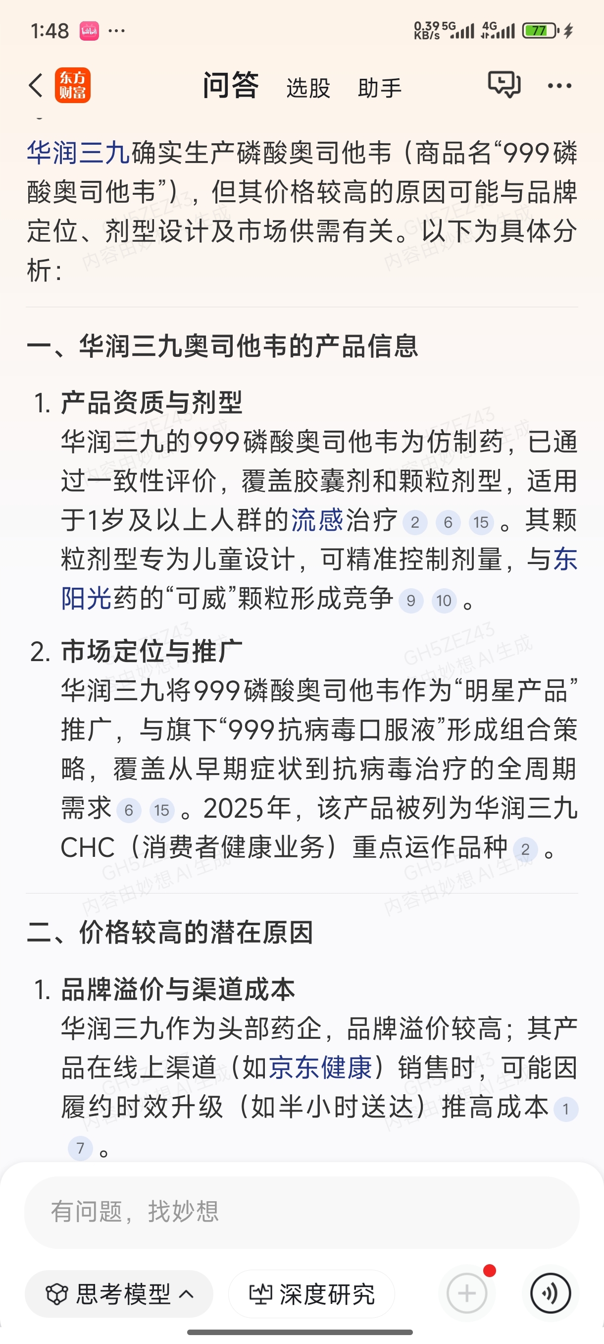 $华润三九(SZ000999)$ 三九的奥司他韦降点价会不会销量更好