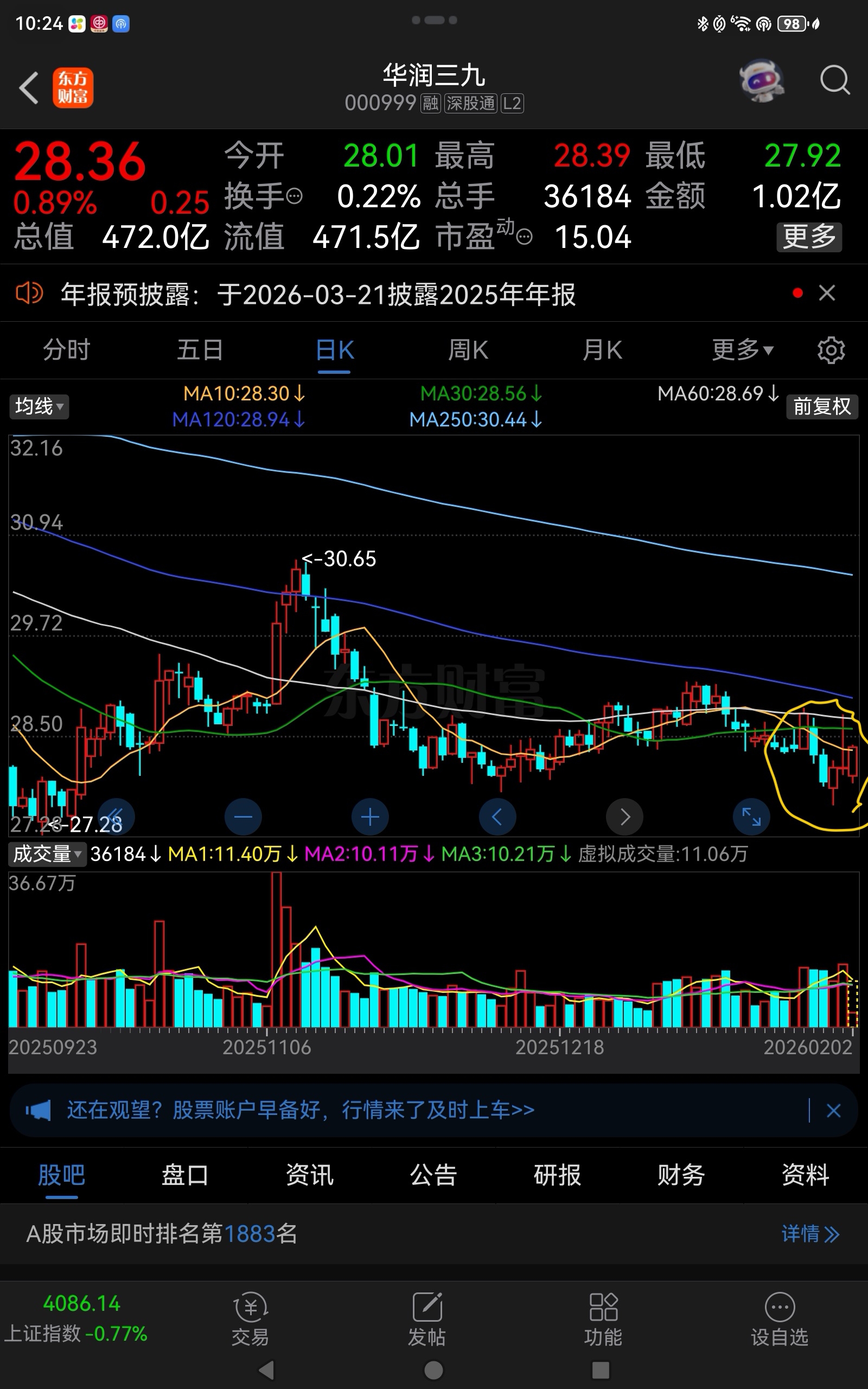 $华润三九(SZ000999)$ 年前两周,能回到29以上?买了几千股玩玩