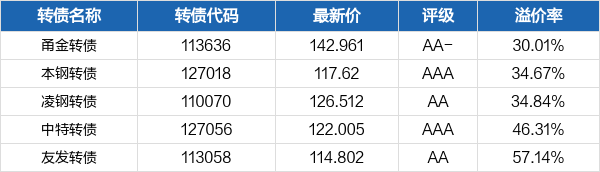 当前大中转债溢价率 = 100% *(债券面值 / 转股价值 - 1) = 100% *(100 / 99.38 - 1) = 0.62%。结合行业、评级等因素后筛选出如下相似转债: