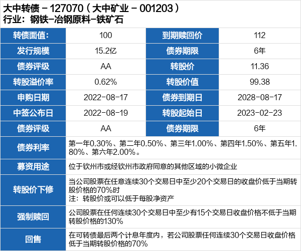 大中转债本次债券融资规模为15.2亿。本次发行规模一般,可转债规模越大流动性越好。