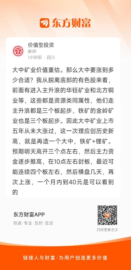 大中矿业价值重估。那么大中要涨到多少合适?我从脱离底部的有色股来看,前面有进入主升浪的华钰矿业和北方铜业等,这些都是资源类同属性,他们走主升浪都是三个板起步,铁矿的金岭矿业也是三个板起步。因此大中矿业上市五年从未大涨过,这一次理应创历史新高,就是再造一个大中,铁矿+锂矿。预期明天高开三个点左右,然后主力资金逐步推高,在10点左右封板,最近可能连续四个板左右,然后横盘几天,再次上涨,一个月内到40元是可以看到的