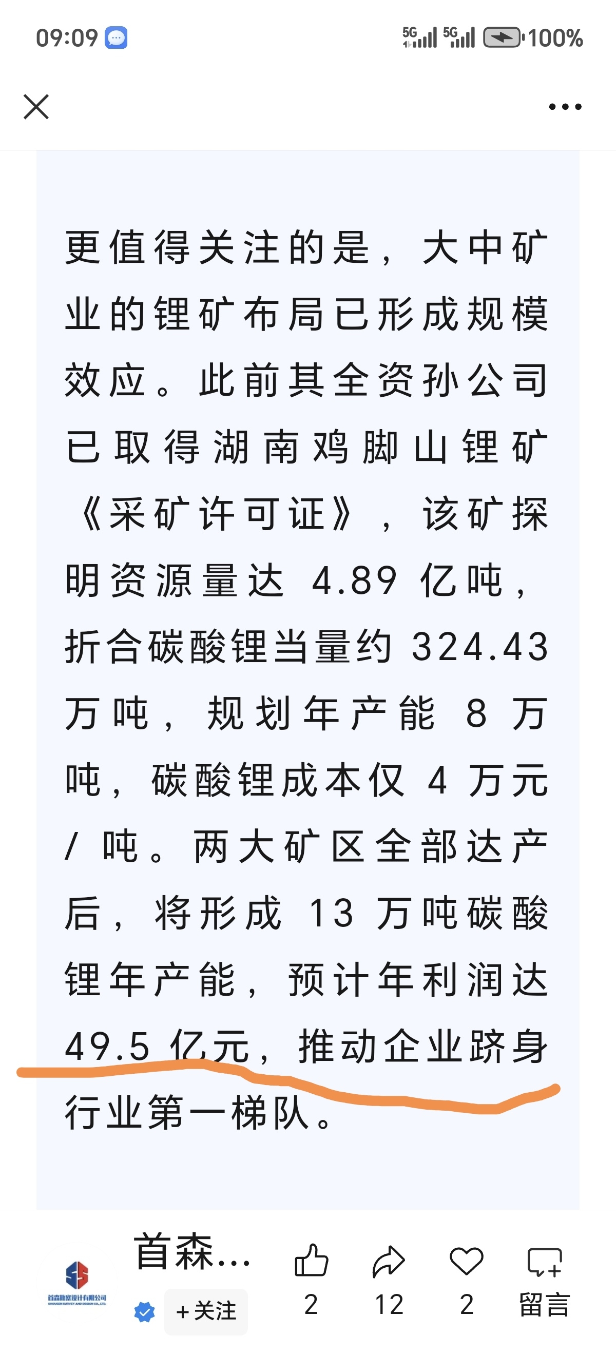 $大中矿业(SZ001203)$ 【投资话题】对大中未来股本业绩的一点看法和预判。转股完成后总股本16.40多亿股(恰好与天齐相近),在股价达到某个阶段,如考虑增发(A股或H股)融资投入,可以扩大总股本至20亿左右(与赣锋相当)。按当前碳酸锂8~10万元/吨价格,公司按20万股总股本保守计算每股收益当在2.5元左右(当然如果锂价继续上涨则业绩将大超预期)。从中长期看当前估值处于低位。
