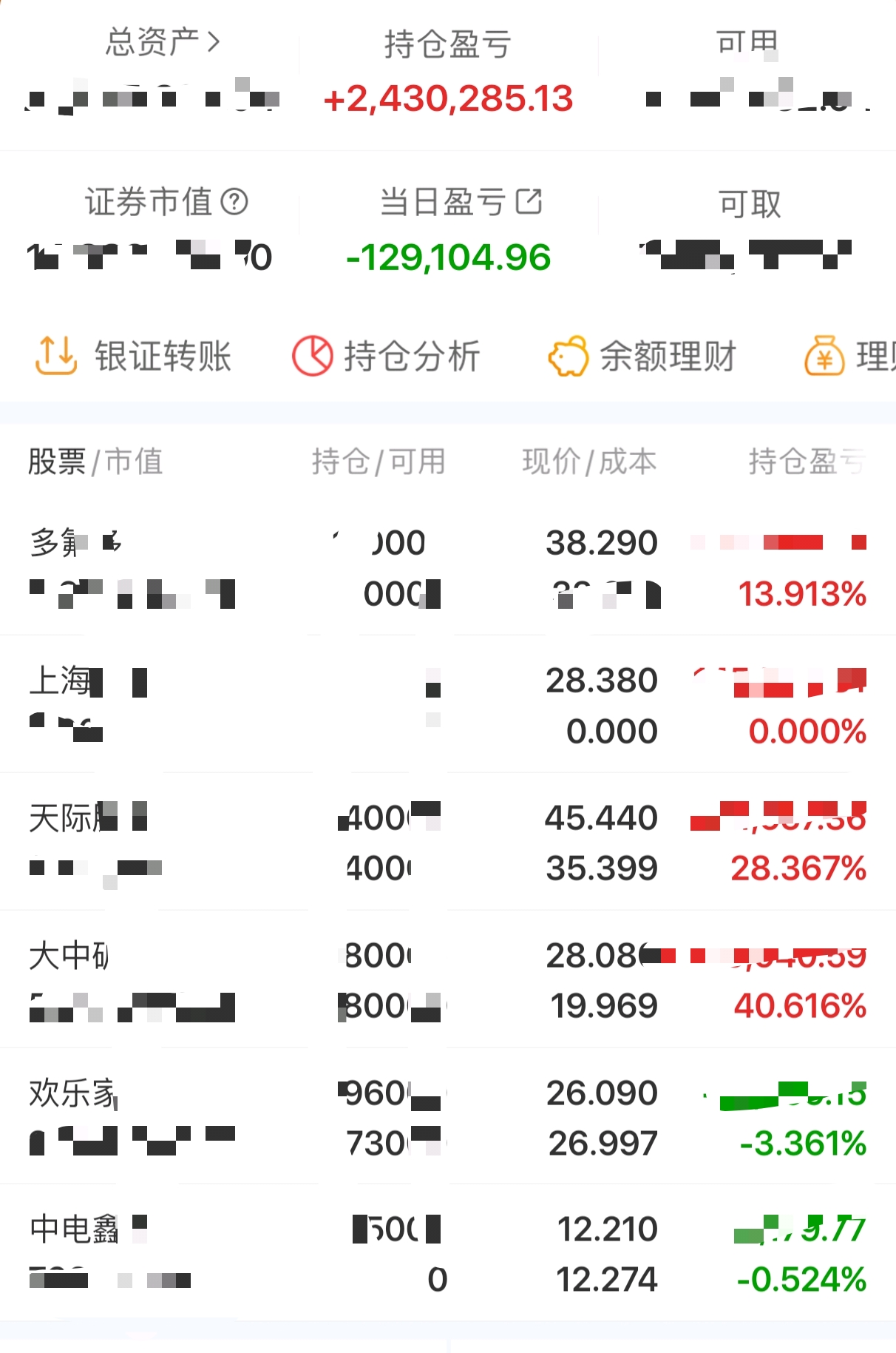 各位下午好,简单记录一下今作!今日早盘还是保持观望为主。手中$大中矿业(SZ001203)$ 强者恒强保留!$天际股份(SZ002759)$ 减仓了保存实力先!$欢乐家(SZ300997)$ 消费。中电鑫龙:电力都有望接替成为主线,跟着提前布局一下。多氟多:依旧稳定,格局观望!今日出局上海沪工:回踩5日线再考虑接回!