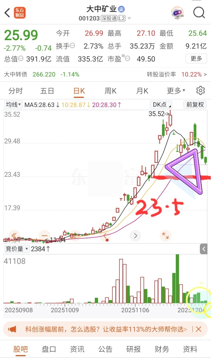 $大中矿业(SZ001203)$ 下跌趋势持续中,短期位可能继续下探破位在23.5,继续看空,看明天是否能低开低开的话就应该收红,如果还是高开那基本无望了,上个礼拜一个涨停庄家配合利好出货,连续四连跌,后续的话走势还是有很高风险,毕竟是十月份10多块翻了三倍,现在还处于高位,下个破位在23.5,两个走向第一继续下杀,第二震荡起稳,看明天走势了