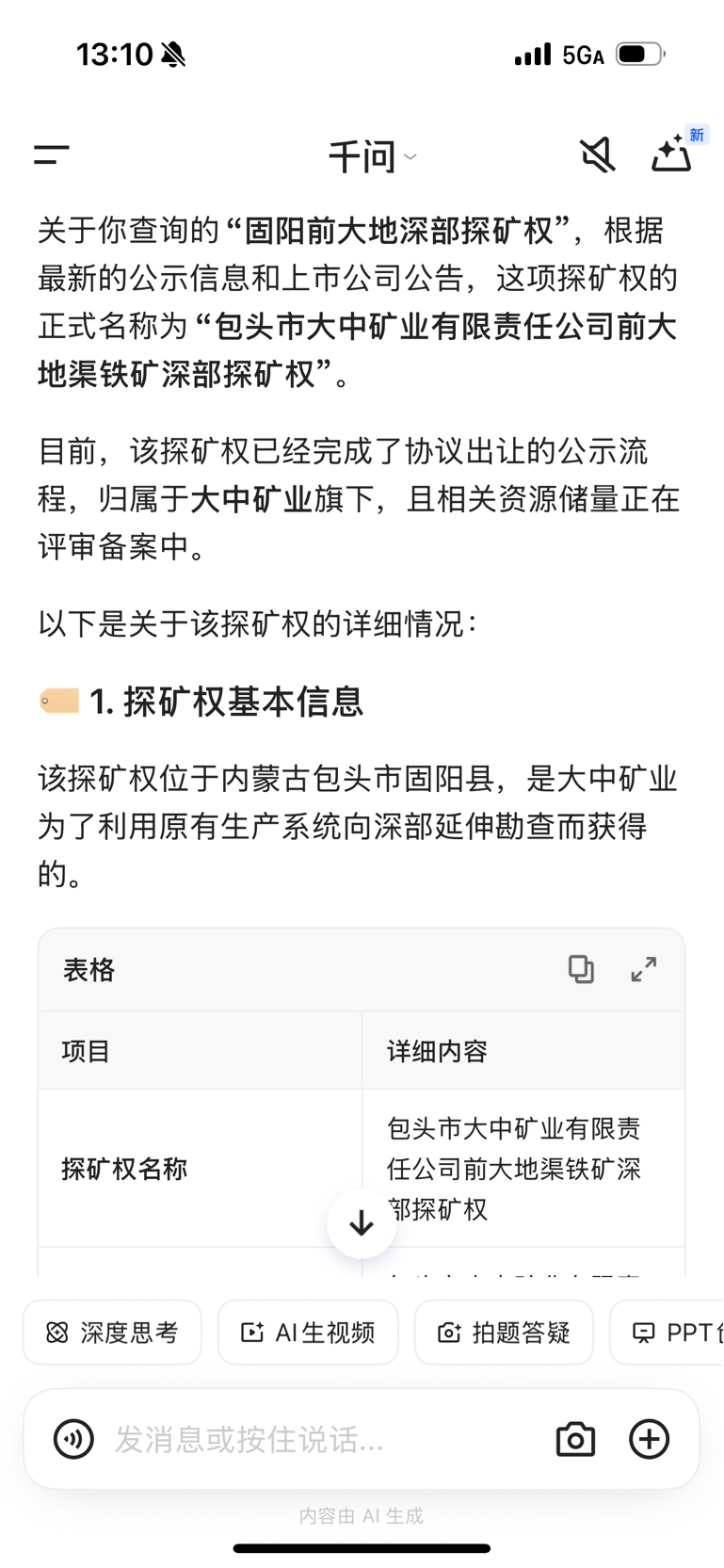 $大中矿业(SZ001203)$ 大中矿业又取得固阳前大地渠铁矿探矿权!