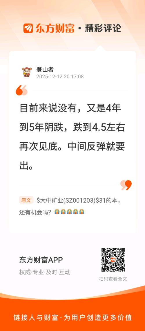 脑癌患者//@登山者 :目前来说没有,又是4年到5年阴跌,跌到4.5左右再次见底。中间反弹就要出。
