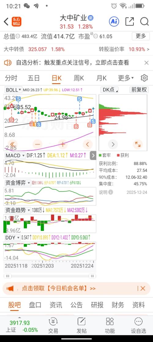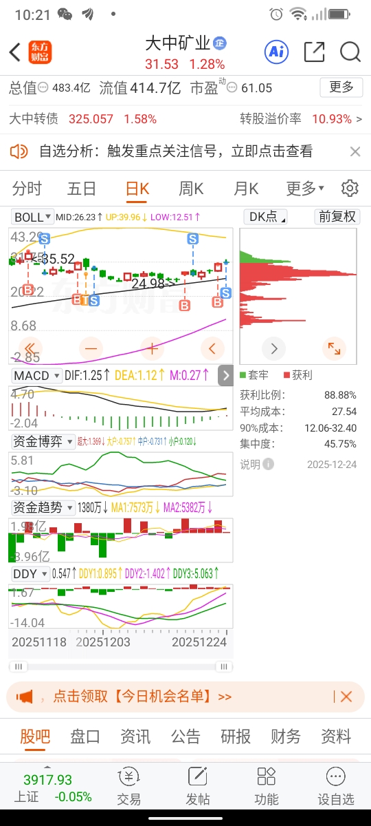 $大中矿业(SZ001203)$ 元旦接近,年度总结,小散永远不打烊,持仓不多大中矿业,过夜的新债有套进,今天会有点反弹,性急的解套可走,有耐力的坚守阵地,也不需要多问走时自会说