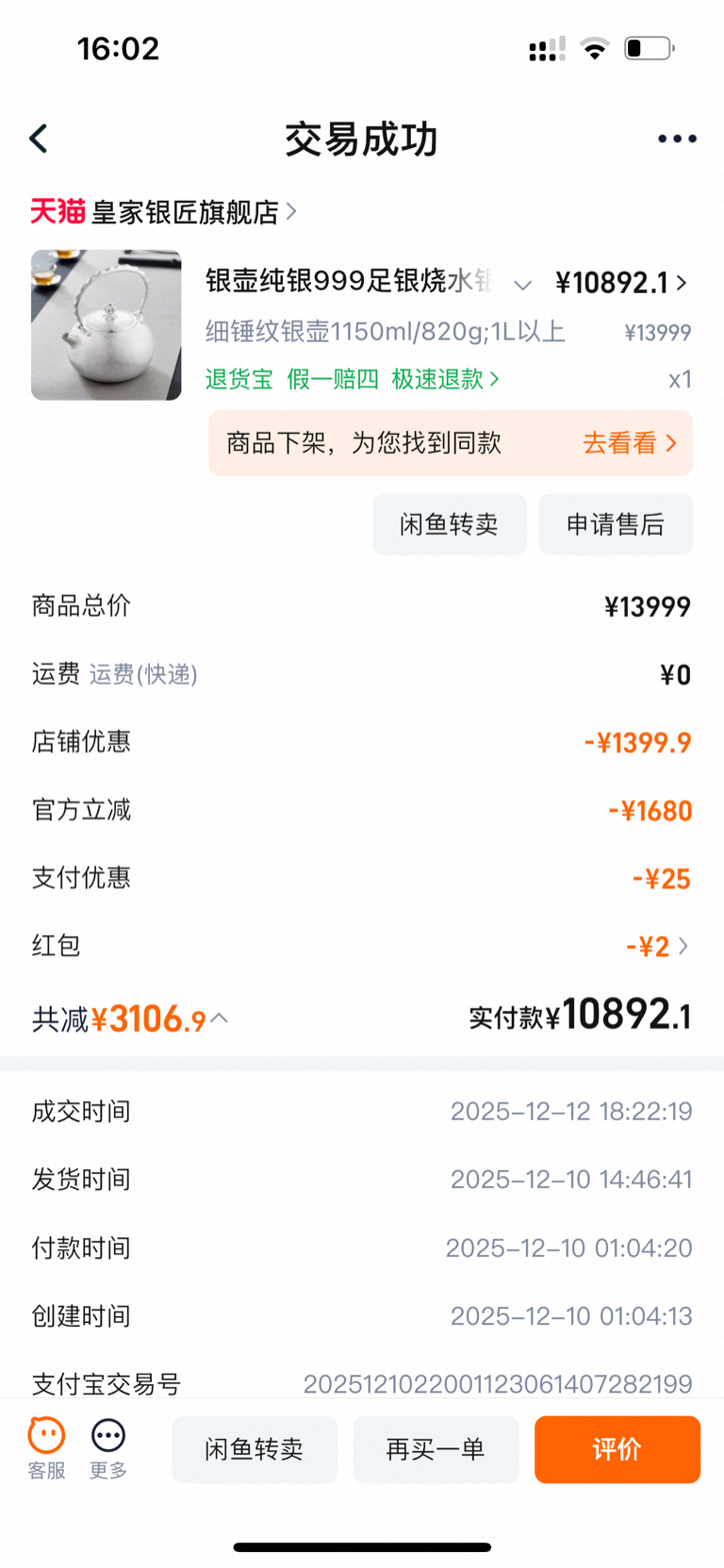 12月10日顺便淘宝买了把足银水壶犒劳自己,825克10900元,现在2万是起步价。