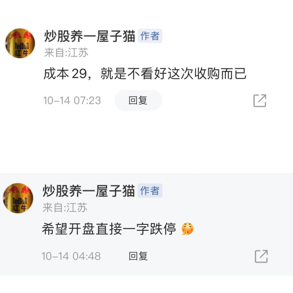 成本29,不看好收购,希望开盘跌停,第一次见人有这种要求