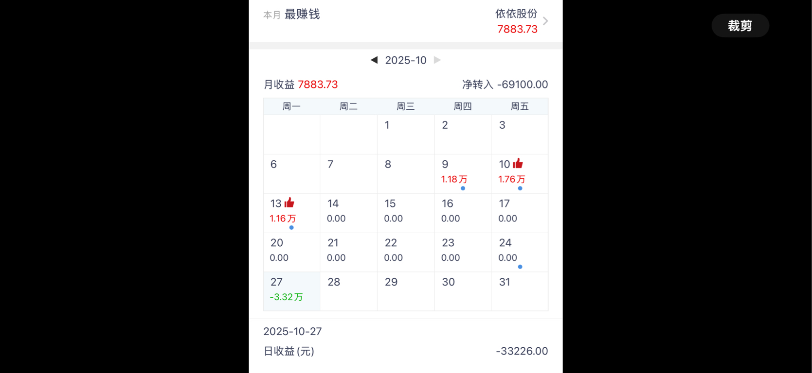 $依依股份(SZ001206)$ 作为一个操作高超稳扎稳打的选手,这种无厘头跌幅把我十月份收益几乎都干掉了,很黑色喜剧风。其实并不怕跌幅,怕的是画风逻辑不清晰。