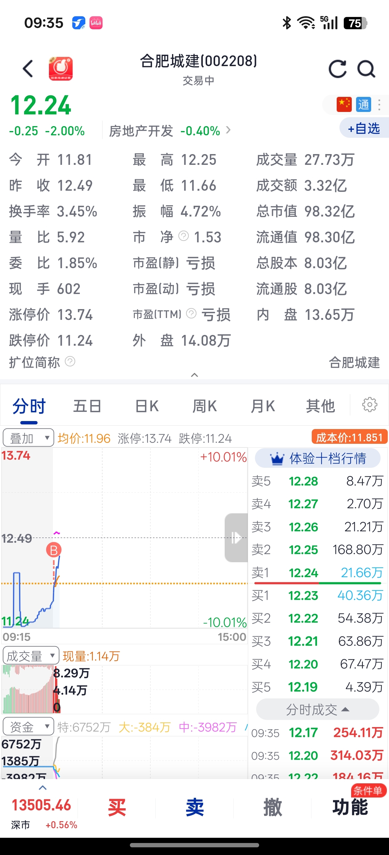 盘中做t注意回落凤险!受5日线压制!控制仓位?新开合肥城建!控制仓位!大回调看到