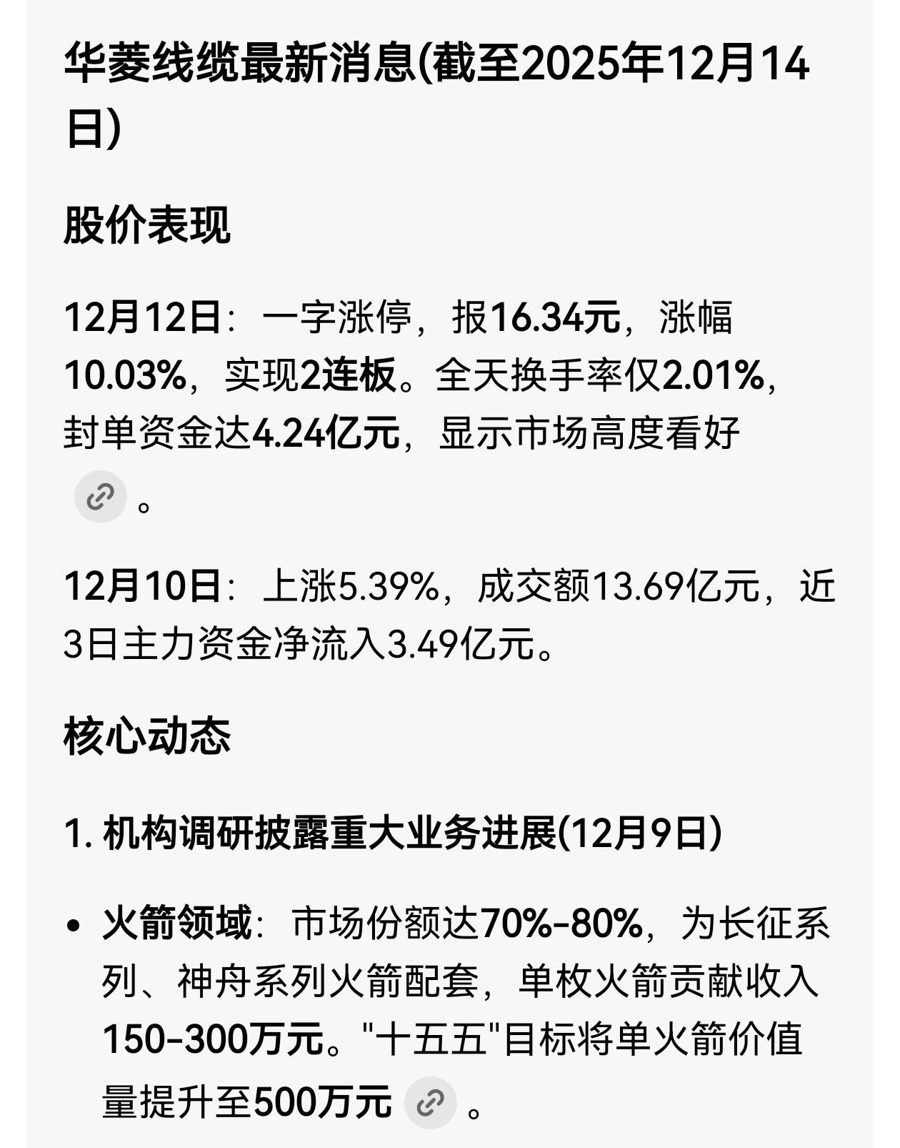 $中国西电(SH601179)$ $雪人集团(SZ002639)$ 为什么近期华菱线缆能够成为大A最强势个股?资金抢筹,都是实实在在的利好落地。商业航天线缆电缆占比70%-80%订单+可控核聚变+电网设备+机器人+军工+重大收购+定向增发12.15亿