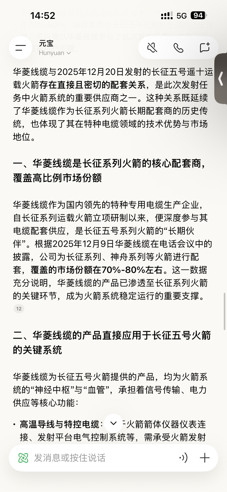 华菱线缆是长征系列火箭的核心配套商,覆盖的市场份额在70%-80%左右。