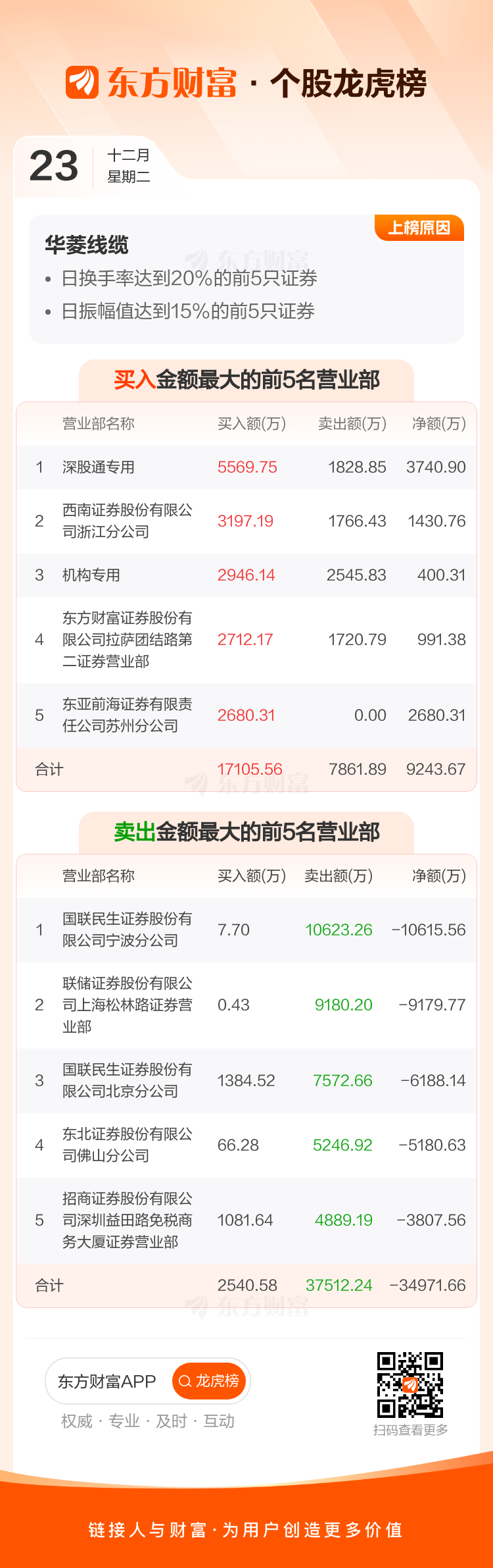 交易所2025年12月23日公布的交易公开信息显示,华菱线缆因成为日换手率达到20%的前5只证券、日振幅值达到15%的前5只证券上榜。华菱线缆当日收报19.84元,涨跌幅-5.66%,偏离值56.80%,换手率56.76%,成交额32.02亿。