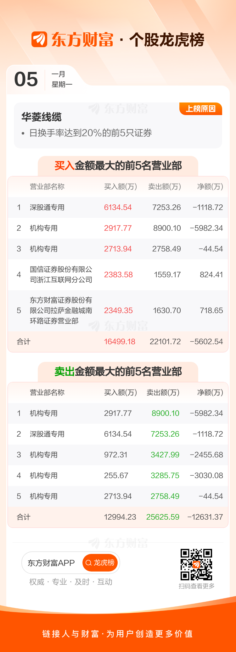 交易所2026年1月5日公布的交易公开信息显示,华菱线缆因成为日换手率达到20%的前5只证券上榜。华菱线缆当日收报23.45元,涨跌幅-2.45%,偏离值38.34%,换手率38.32%,成交额23.83亿。
