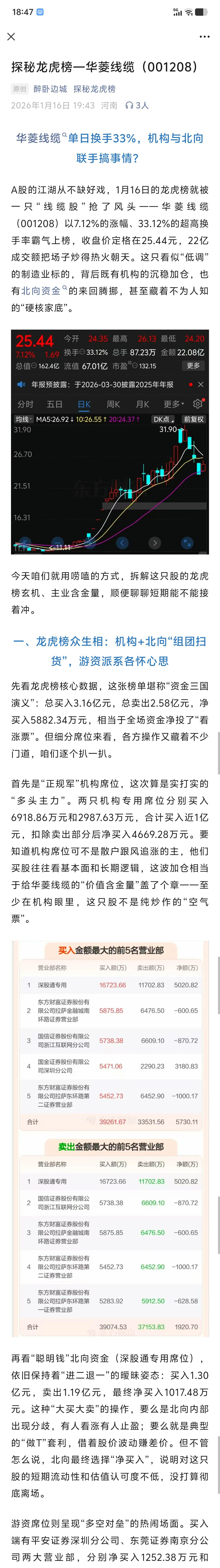 $华菱线缆(SZ001208)$ A股的江湖从不缺好戏,1月16日的龙虎榜就被一只“线缆股”抢了风头——华菱线缆(001208)以7.12%的涨幅、33.12%的超高换手率霸气上榜,收盘价定格在25.44元,22亿成交额把场子炒得热火朝天。这只看似“低调”的制造业标的,背后既有机构的沉稳加仓,也有北向资金的来回腾挪,甚至藏着不为人知的“硬核家底”。