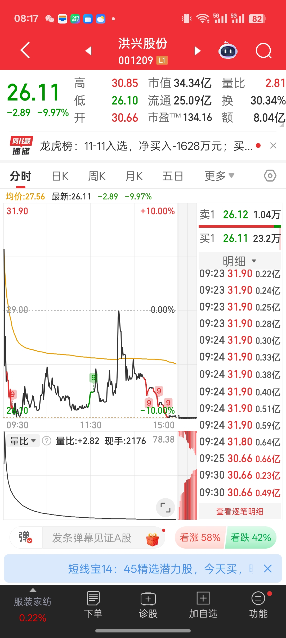 $洪兴股份(SZ001209)$ 我就不信这么高进入的人!今天会卖,所以兄弟们不要担心,他们会拉的