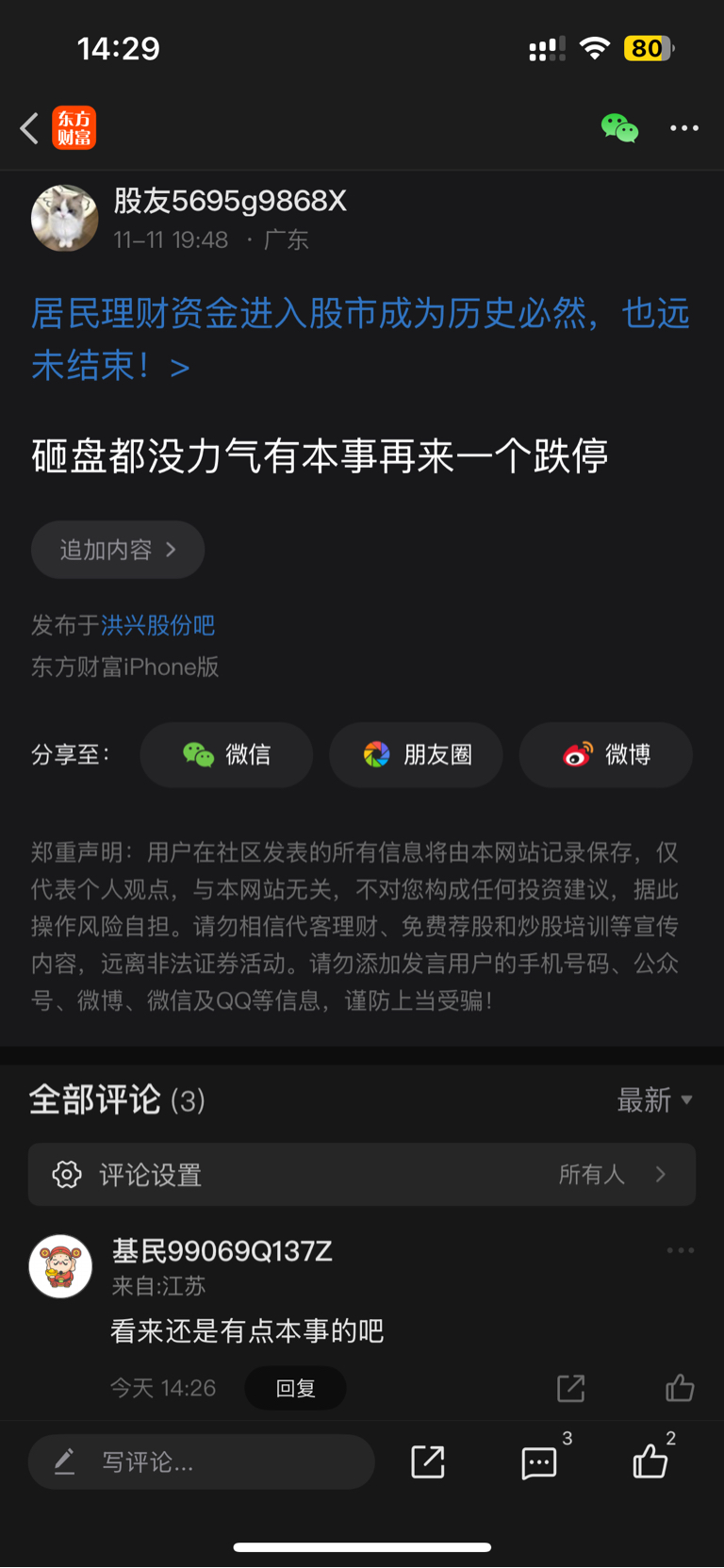 温馨提示: 1.根据《证券法》规定,禁止编造、传播虚假信息或者误导性信息,扰乱证券市场;2.用户在本社区发表的所有资料、言论等仅代表个人观点,与本网站立场无关,不对您构成任何投资建议。用户应基于自己的独立判断,自行决定证券投资并承担相应风险。《东方财富社区管理规定》