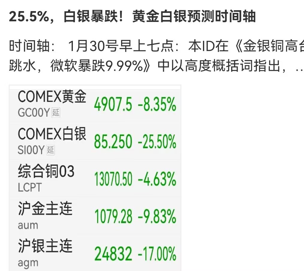 黄金、白银昨夜崩盘,白银盘中跌36%,黄金跌超12%。黄金收跌9.52%,白银收跌25.5% 多方一夜三次爆仓