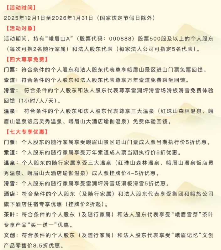 公告显示,从12月1日至2026年1月31日,持有500股及以上的个人股东和法人股东,可享受峨眉山景区进山门票免费的权益等。