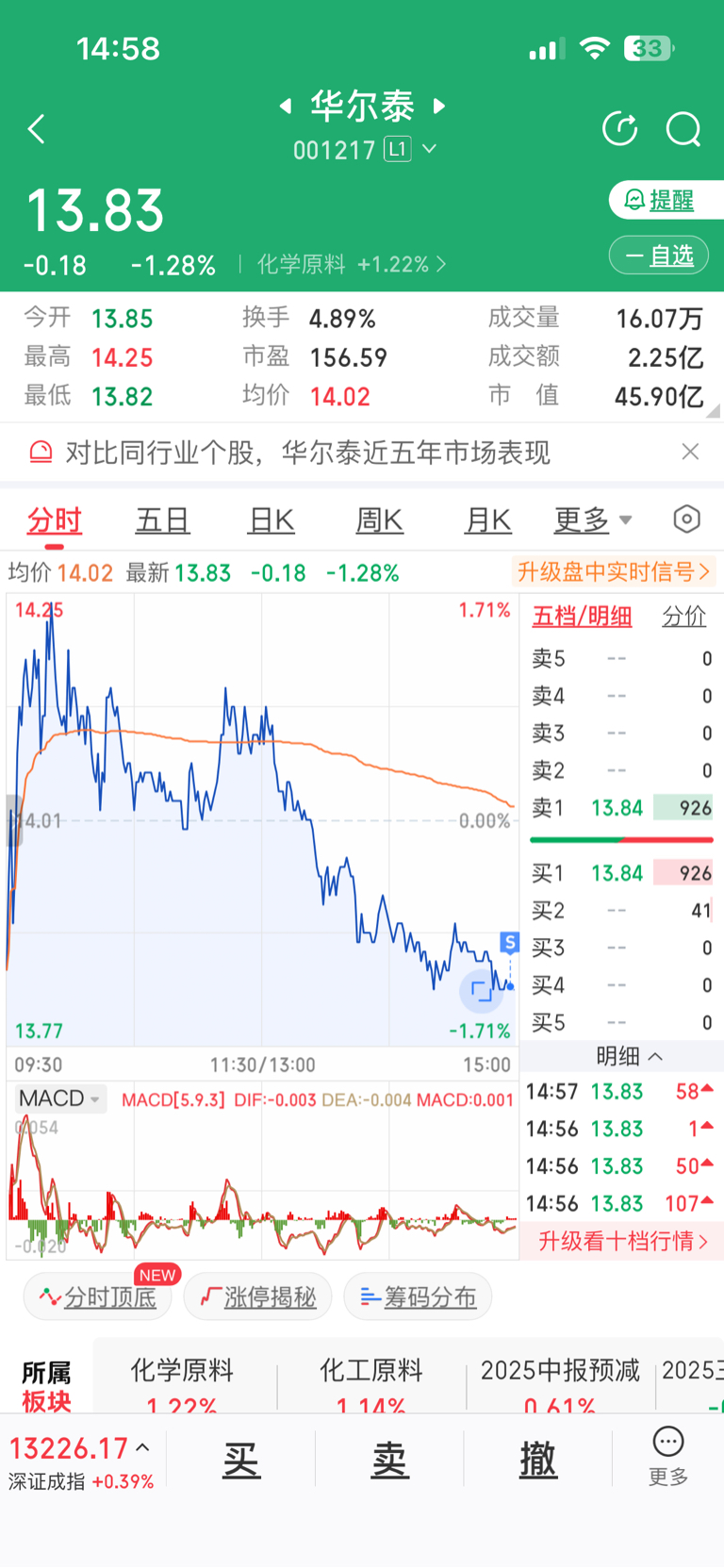 $华尔泰(SZ001217)$ 赚25个点时选择格局,回吐5个点利润今天在最低点卖掉了,虽然是回踩5日线,今天的吊线不太好先出来观望。