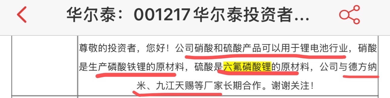公司硝酸和硫酸产品已经用于锂电池行业,硝酸是生产磷酸铁锂的原材料,硫酸是六氟磷酸锂的原材料,公司与德方纳米、九江天赐等厂家长期合作