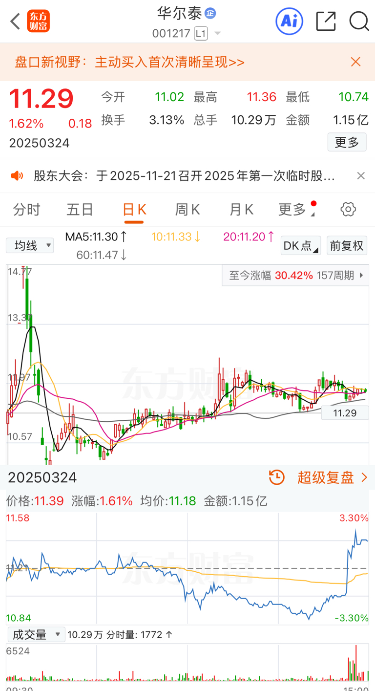$华尔泰(SZ001217)$ 说拉尾盘非奸即盗的,可以说不是真粉,老玩家都知道华尔泰的德行,比如今年三月二十四拉的尾盘,以后三天走出24%的涨幅!