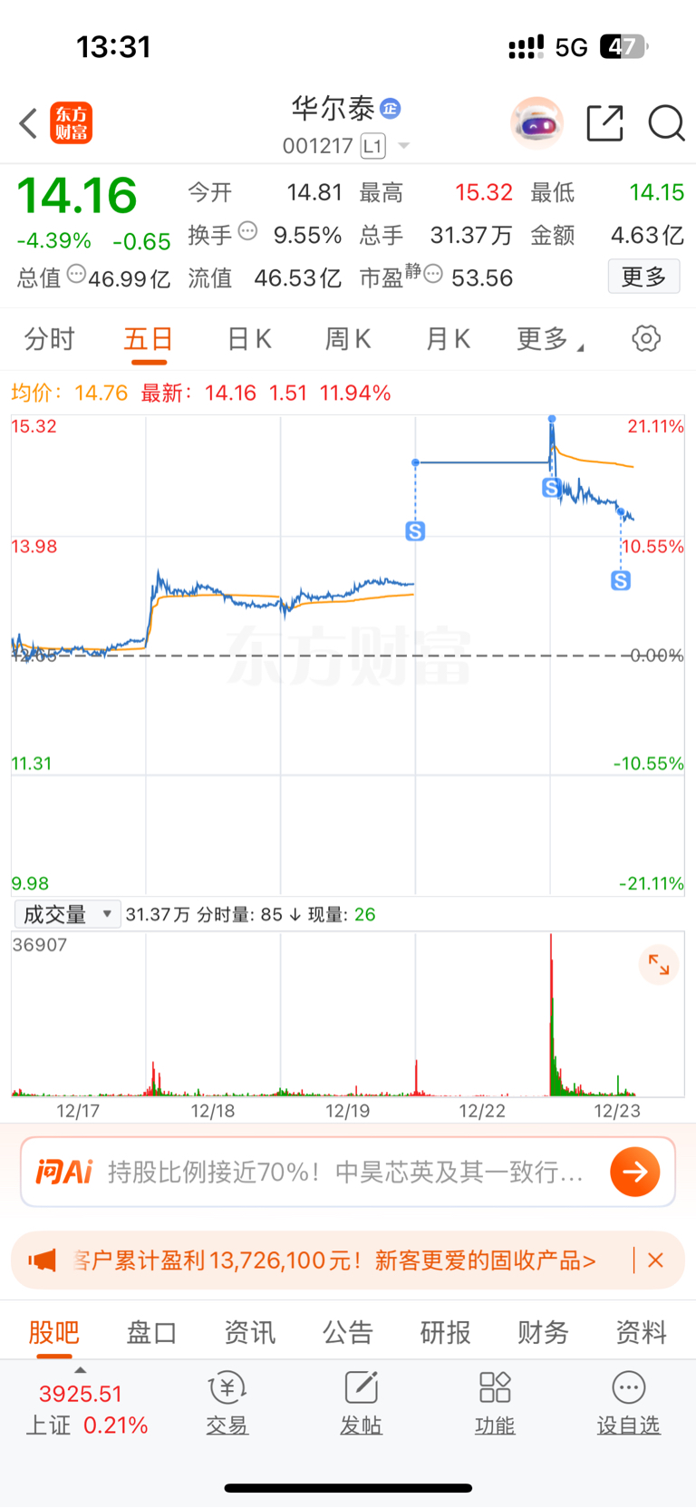 $华尔泰(SZ001217)$ 已清,明年再战,谢谢主力