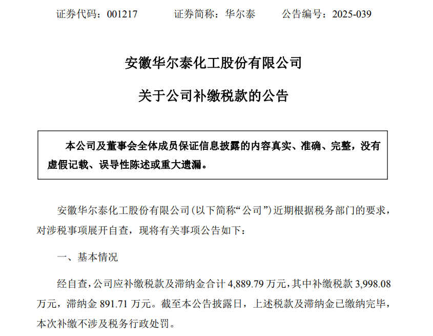 华尔泰表示,前述补缴税款及滞纳金将计入公司2025年当期损益,对公司2025年度净利润的具体影响金额以会计师事务所审计数据为准。本次补缴税款及滞纳金事项不属于前期会计差错,不涉及前期财务数据追溯调整。截至目前,上述税款及滞纳金已缴纳完毕,本次补缴不涉及税务行政处罚。