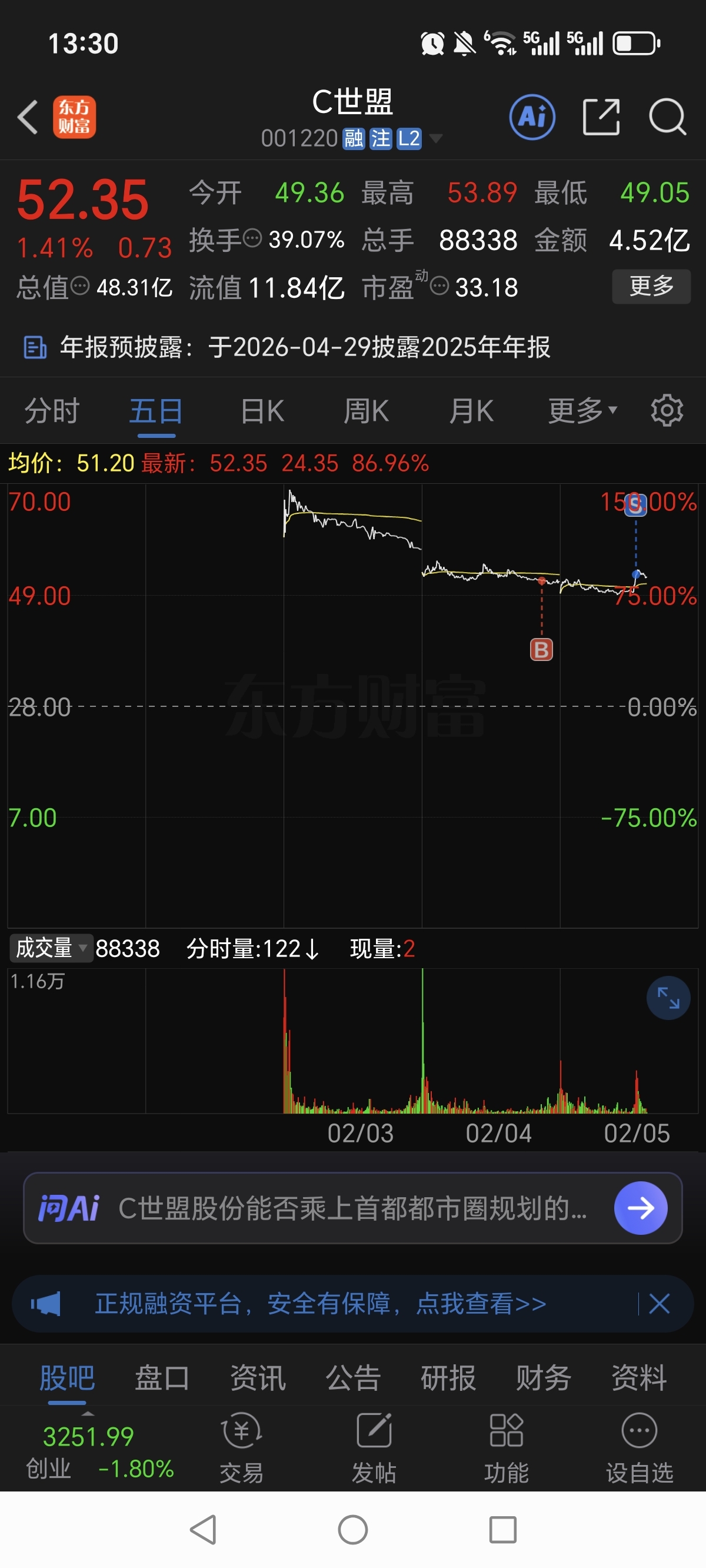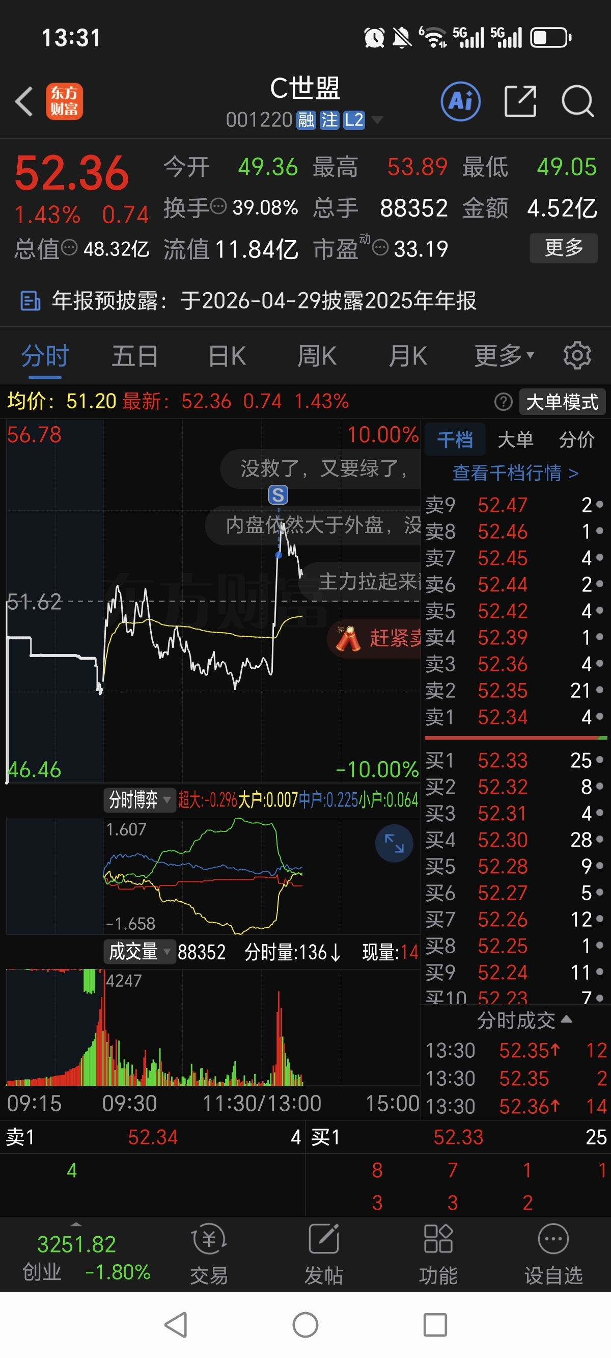 昨天尾盘51.77买的世盟股份,刚刚52.93卖飞,感谢主力的不杀之恩