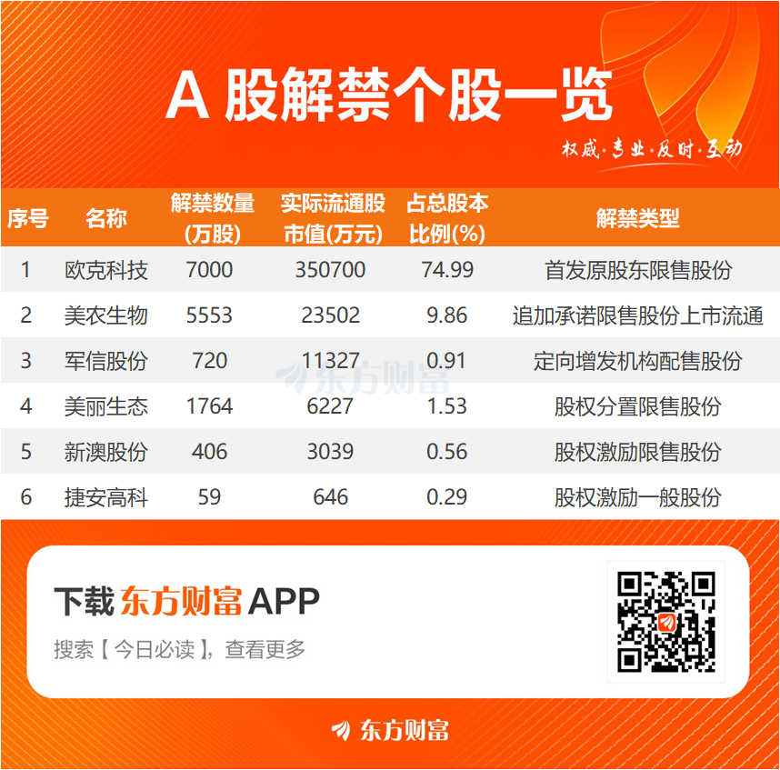 【明日解禁】明日6股解禁 欧克科技、美农生物解禁市值居前