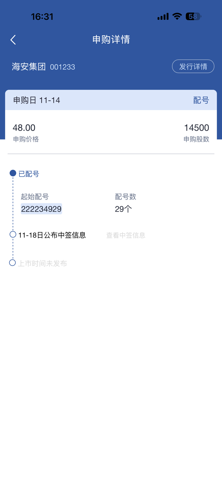 $海安集团(SZ001233)$ 中签号