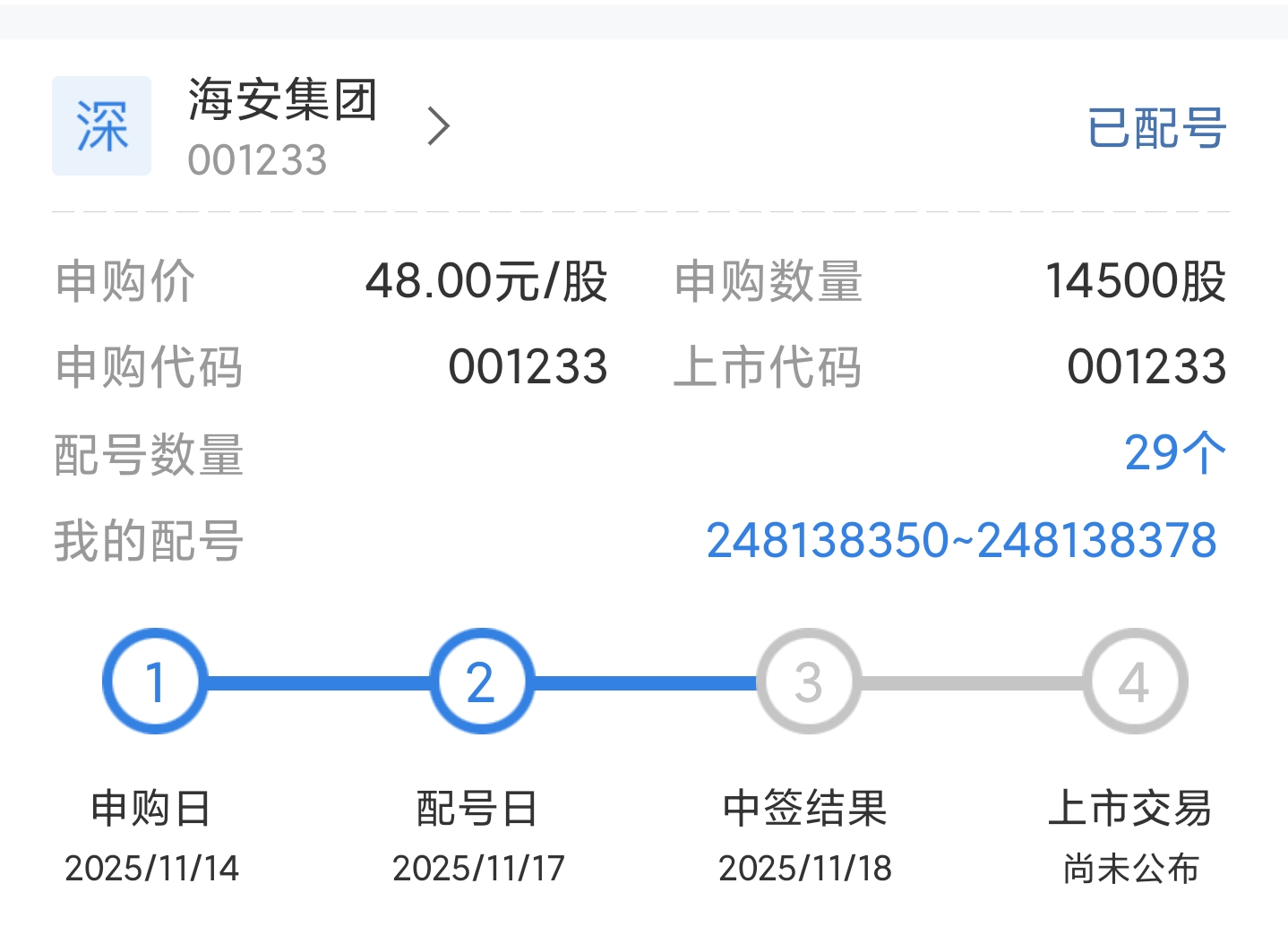 $海安集团(SZ001233)$ 我这号码这么多8,应该能中一签吧?