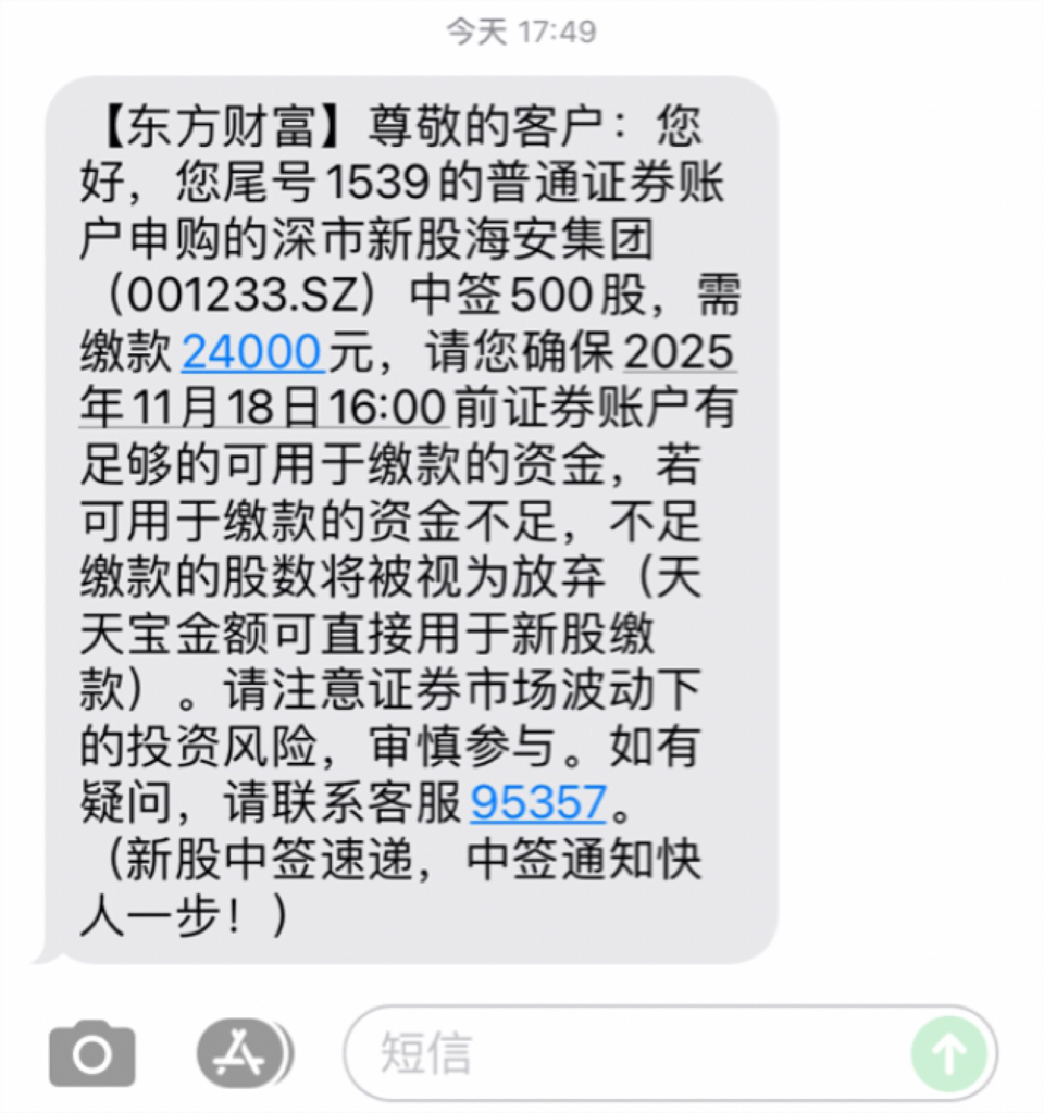 $海安集团(SZ001233)$ 我中签了!!!!好开心好开心!!!!时隔几年,再中一签!!!也祝大家发财!!!