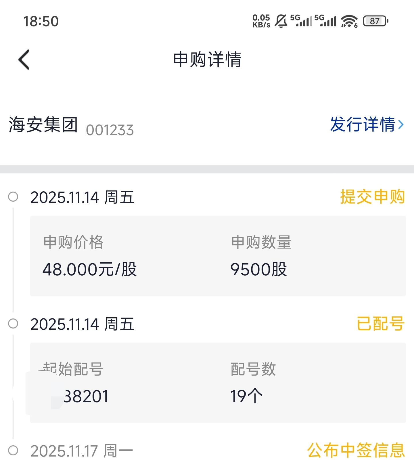 $海安集团(SZ001233)$ 我这个中签有戏吗,今年没咋中过。。