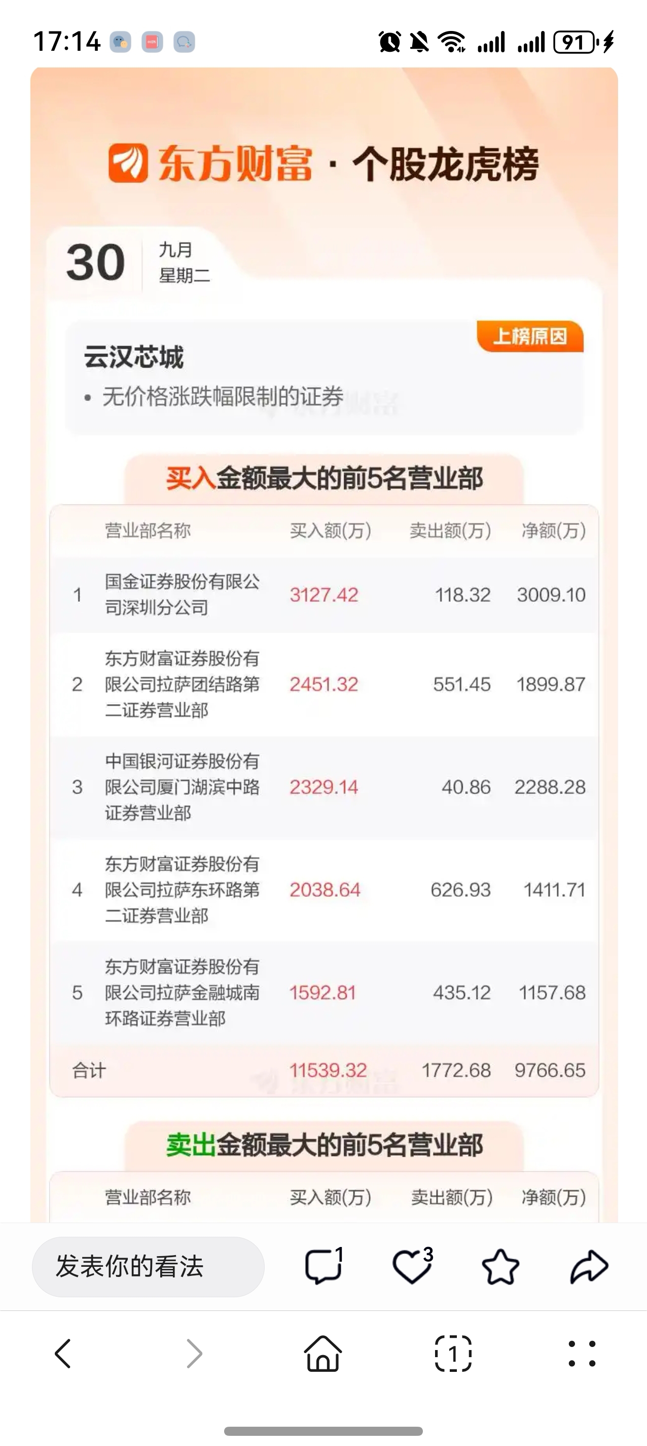 $N海安(SZ001233)$ 榜三就是云汉上市第一天买入的机构,第二天云汉暴涨40%