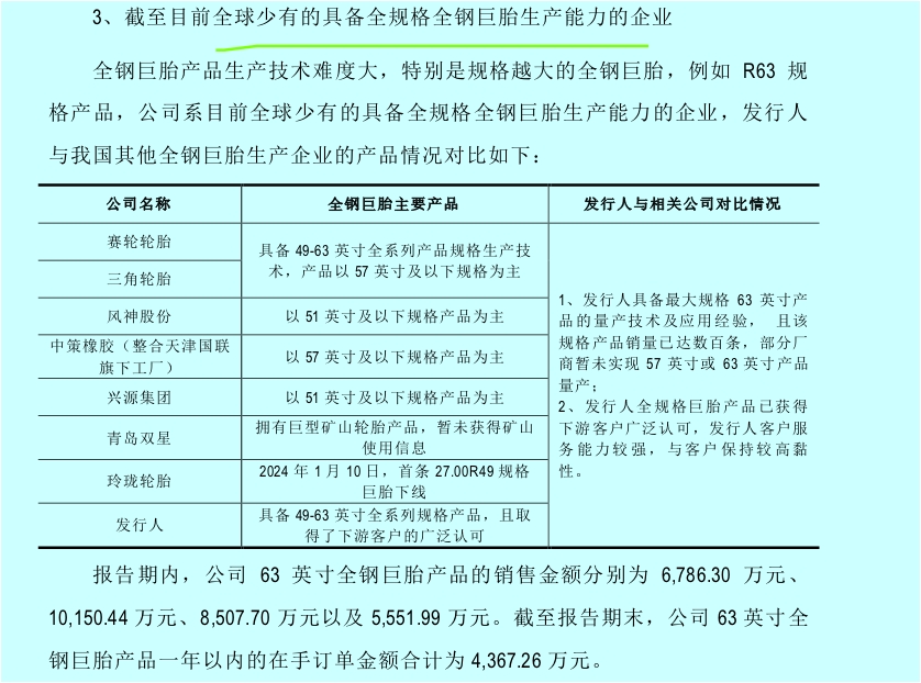 $C海安(SZ001233)$ 全钢巨胎属于细分赛道,技术壁垒非常高。全钢巨胎产品生产技术难度大,特别是规格越大的全钢巨胎,例如 R63 规格产品,公司系目前全球少有的具备全规格全钢巨胎生产能力的企业,发行人与我国其他全钢巨胎生产企业的产品情况对比如下: