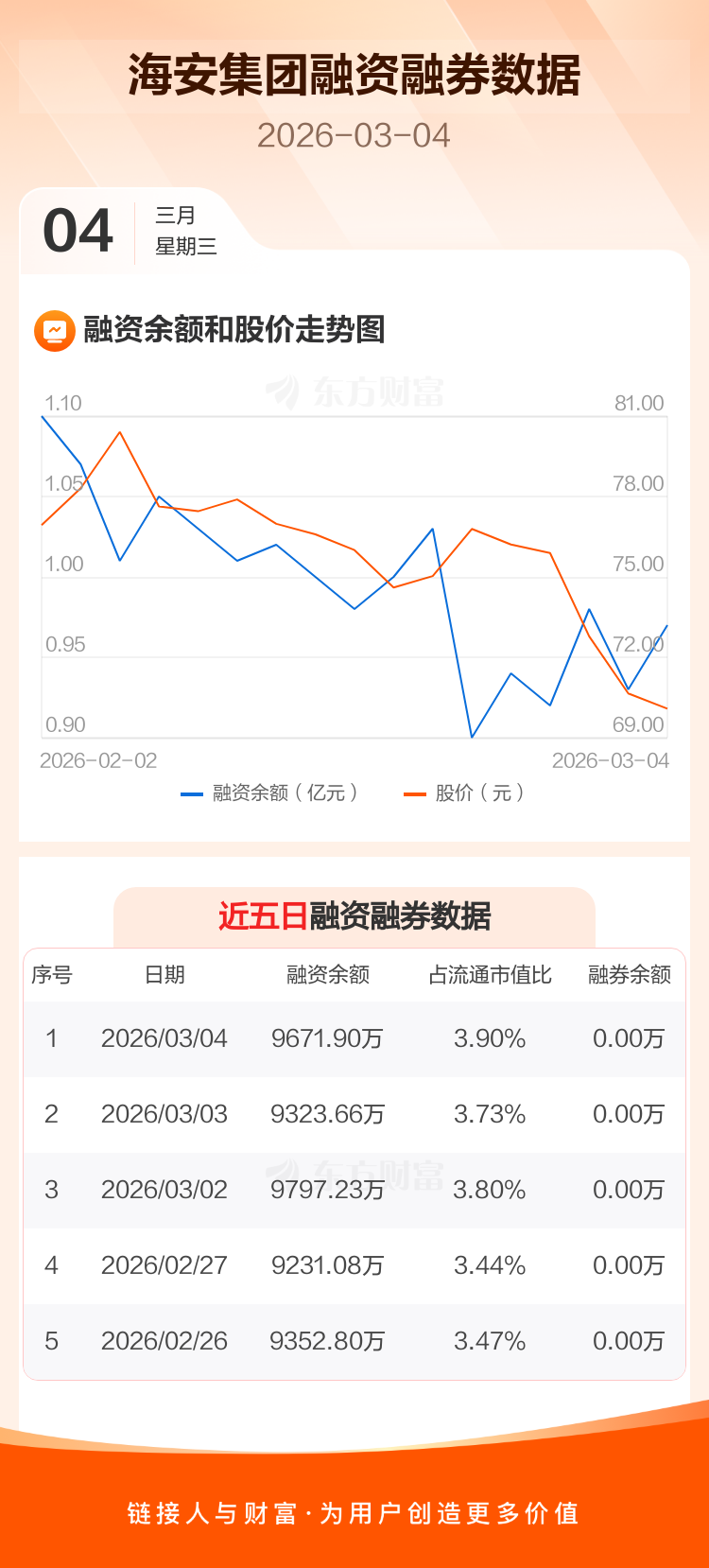 交易所最新数据显示,海安集团于2026年3月4日获融资买入1108.39万元,融资偿还760.16万元,当日融资净买入348.24万元。目前,该股融资余额9671.90万,占流通市值比例为3.90%。
