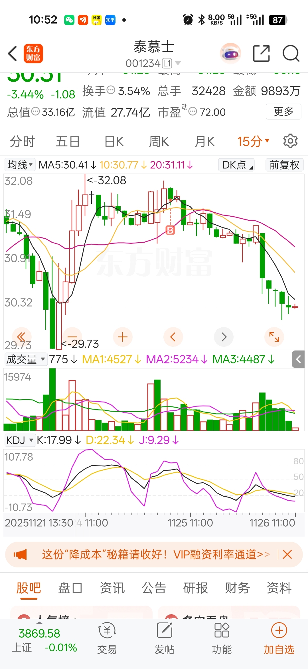 $泰慕士(SZ001234)$ 看15分钟k线,破不了周一的阳线,而且下跌缩量,等于是跌不动了