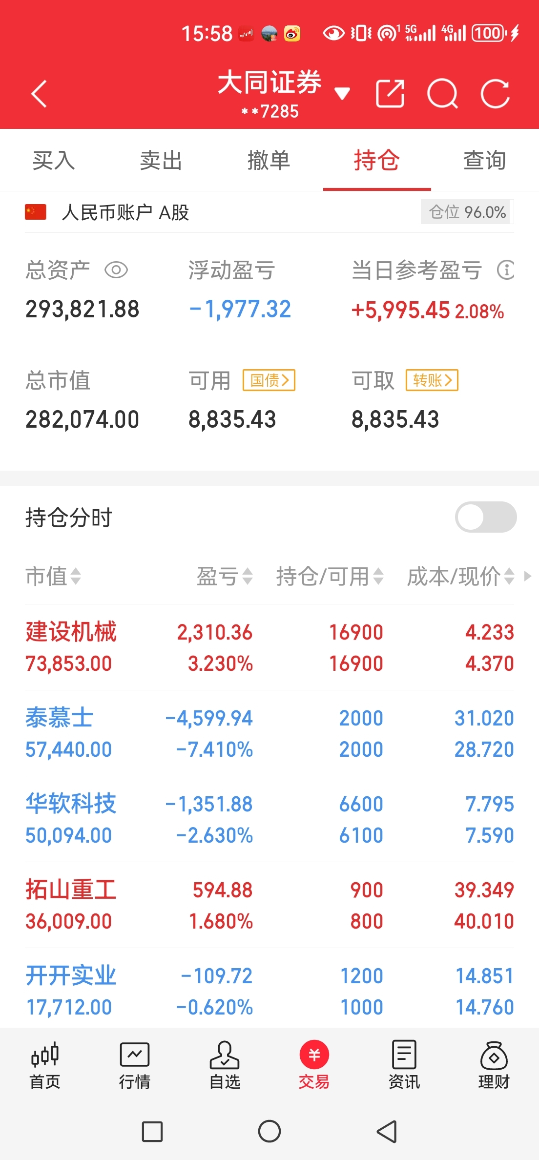 $泰慕士(SZ001234)$ 个人觉得小泰走的有点拉,这几天做个T出来,不能把金钱浪费他这了,个人觉得今天指数大概率是冲高回落,探底回升,好好做个t吧。$建设机械(SH600984)$ $华软科技(SZ002453)$