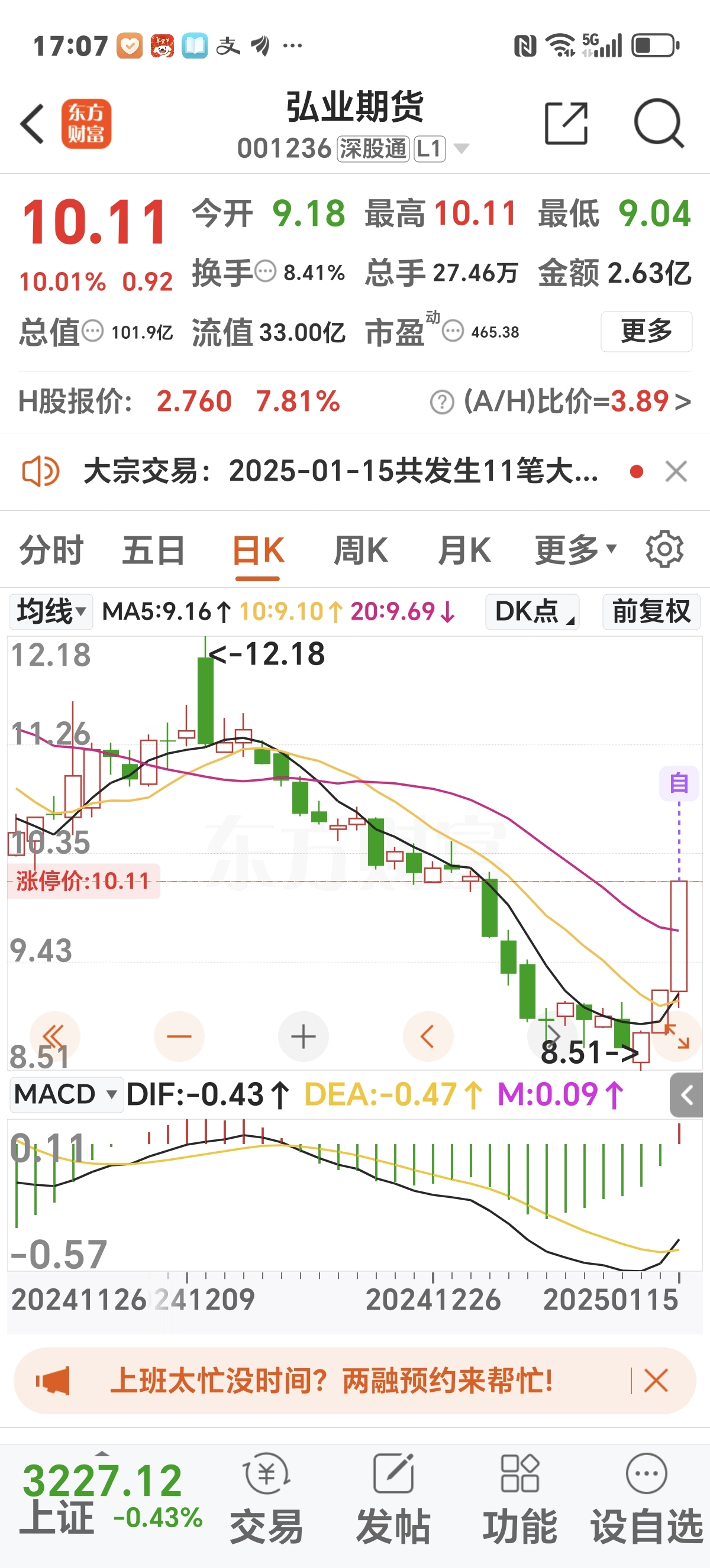 $弘业期货(SZ001236)$ 早上收盘中午加自选想着开盘要买忘买了。看来这钱不归咱赚啊。祝车上的发财。