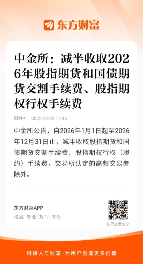 中金所公告,自2026年1月1日起至2026年12月31日止,减半收取股指期货和国债期货交割手续费、股指期权行权(履约)手续费,交易所认定的高频交易者除外。