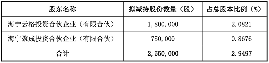 11月28日,博菲电气(001255)公告,公司控股股东、实际控制人的一致行动人海宁云格投资合伙企业(有限合伙)、海宁聚成投资合伙企业(有限合伙)计划通过集中竞价交易方式和大宗交易方式合计减持本公司股份数量累计不超过2,550,000股(占公司总股本比例2.9497%)。