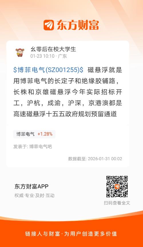 $博菲电气(SZ001255)$ 磁悬浮就是用博菲电气的长定子和绝缘胶铺路,长株和京雄磁悬浮今年实际招标开工,沪杭,成渝,沪深,京港澳都是高速磁悬浮十五五政府规划预留通道